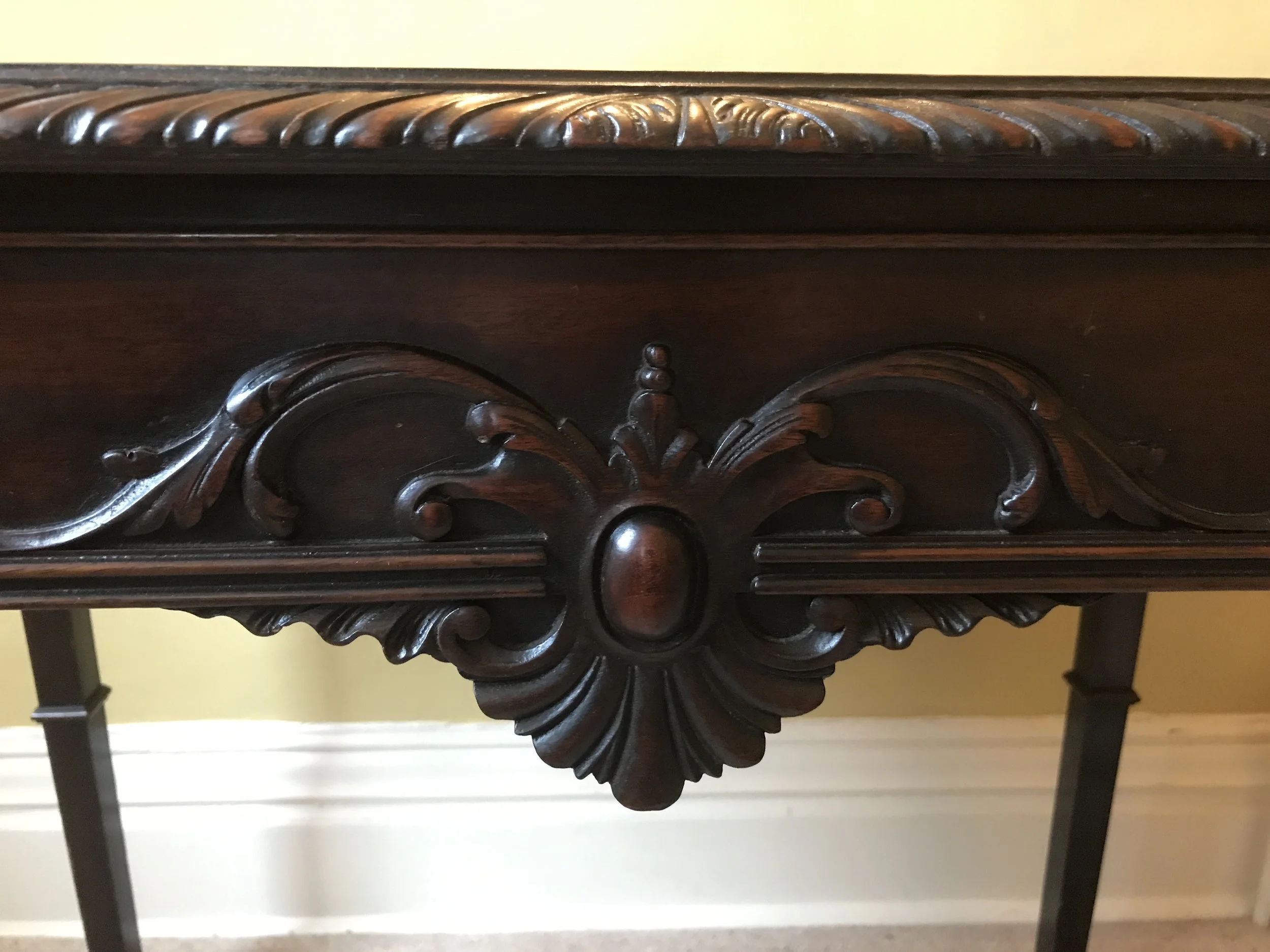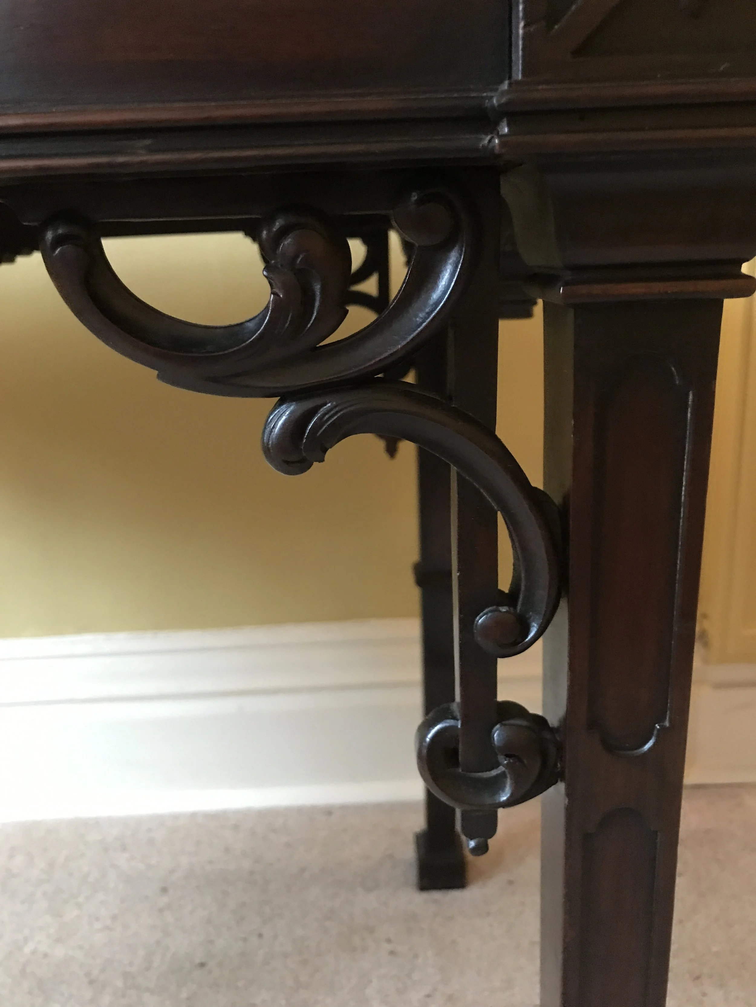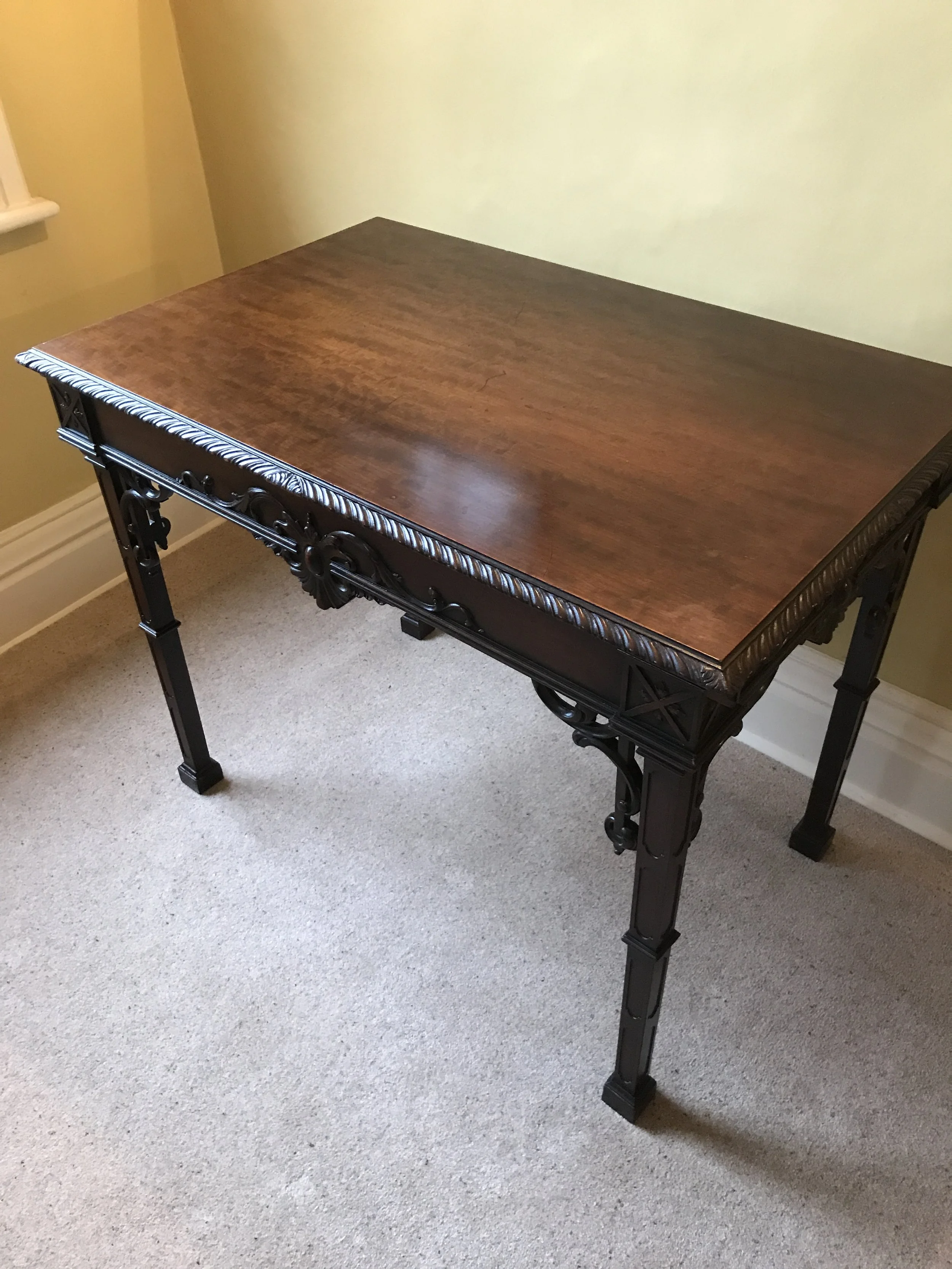 An outstanding quality mahogany table from the 19th century, with carved fret work decoration and a flame mahogany top. £875.00